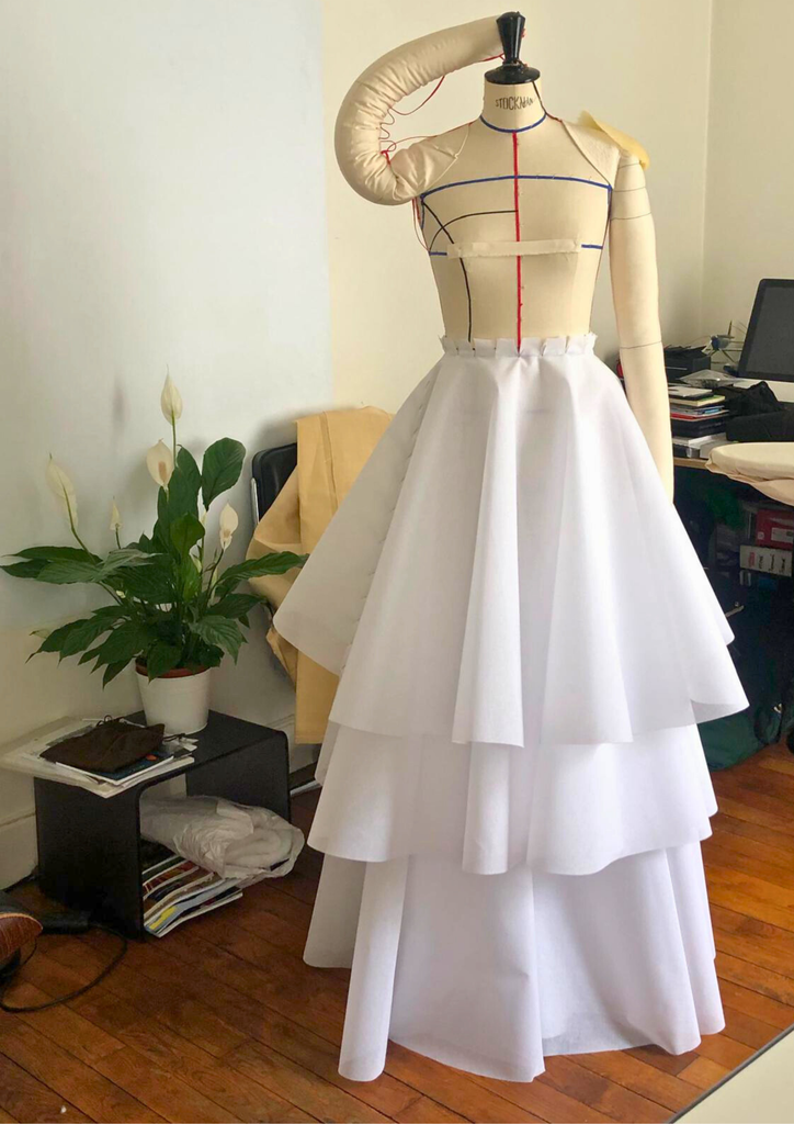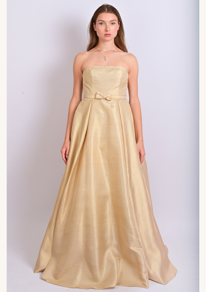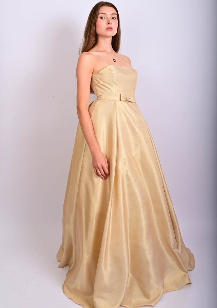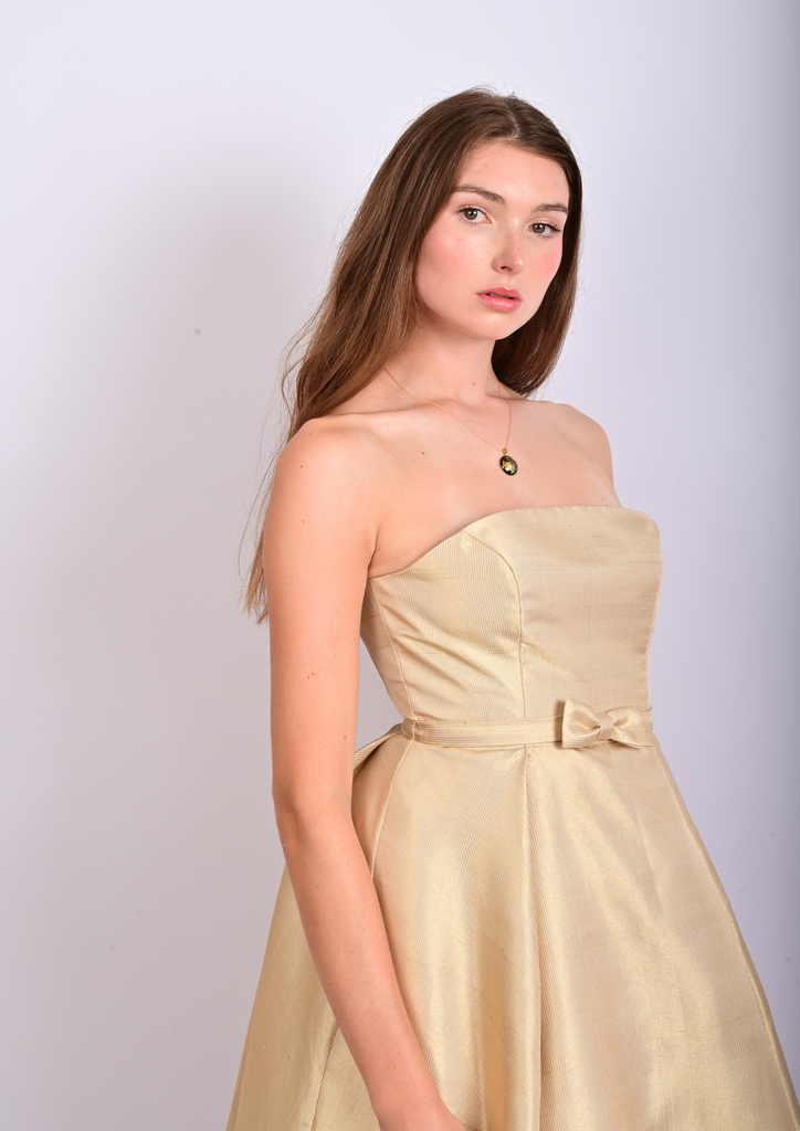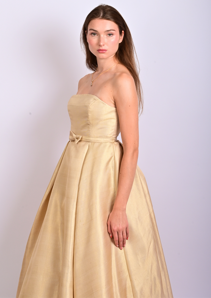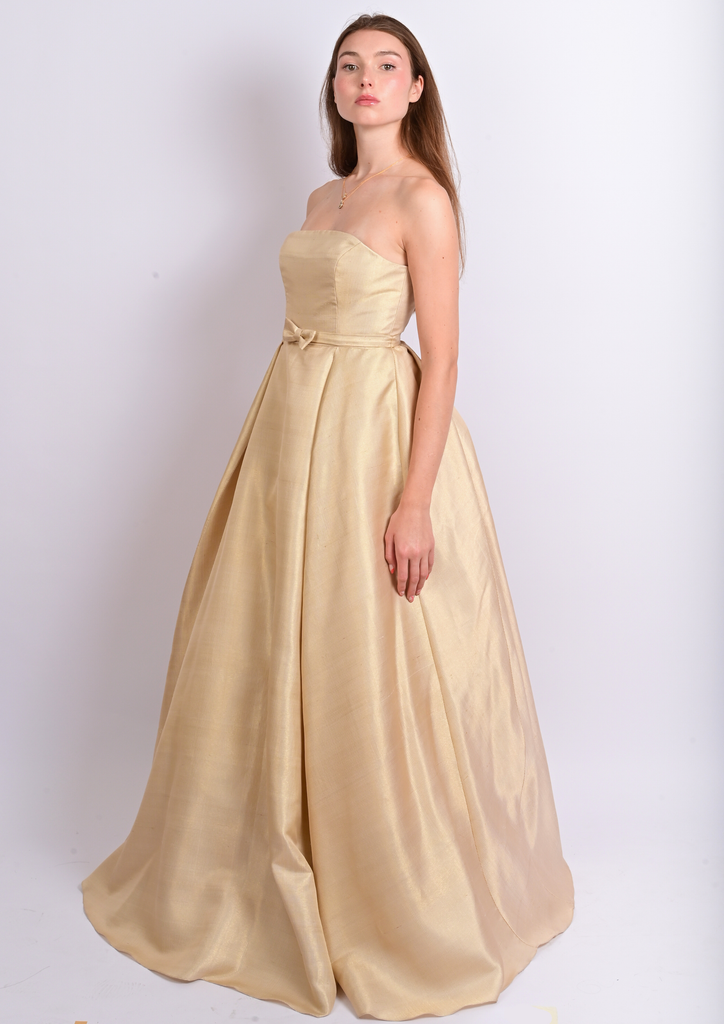 Son architecture révèle un bustier structuré et une jupe sculptée par trois couches circulaires complètes en tarlatane et tulle, générant un mouvement aérien, presque céleste. Deux plis — à l’avant et à l’arrière — s’ouvrent comme des pétales d’or vers l’ourlet, affinant la silhouette dans une harmonie quasi divine. Une ceinture discrète nouée et une fermeture invisible viennent parfaire cet équilibre entre rigueur et splendeur.