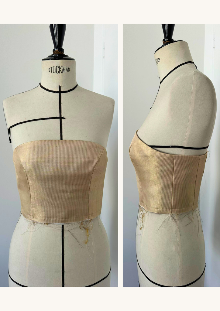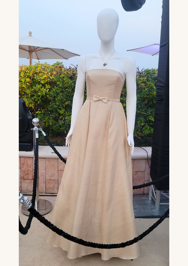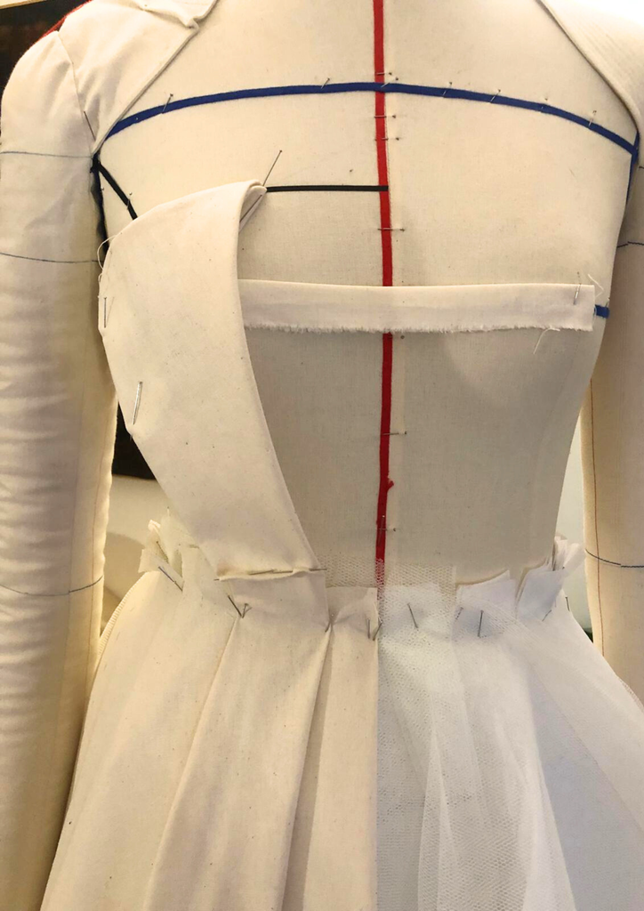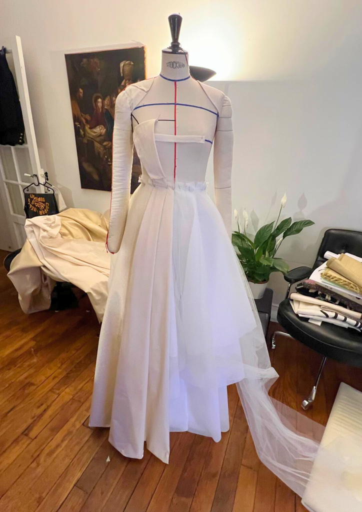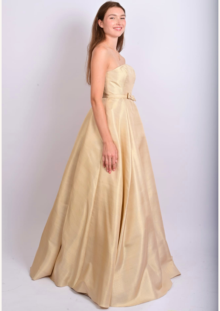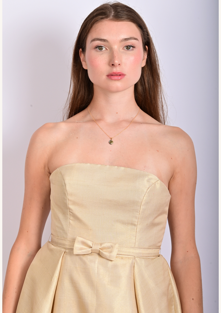 Son architecture révèle un bustier structuré et une jupe sculptée par trois couches circulaires complètes en tarlatane et tulle, générant un mouvement aérien, presque céleste. Deux plis — à l’avant et à l’arrière — s’ouvrent comme des pétales d’or vers l’ourlet, affinant la silhouette dans une harmonie quasi divine. Une ceinture discrète nouée et une fermeture invisible viennent parfaire cet équilibre entre rigueur et splendeur.