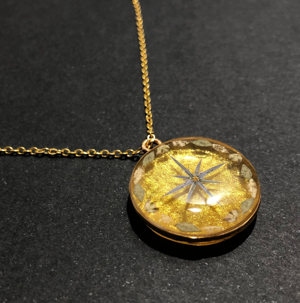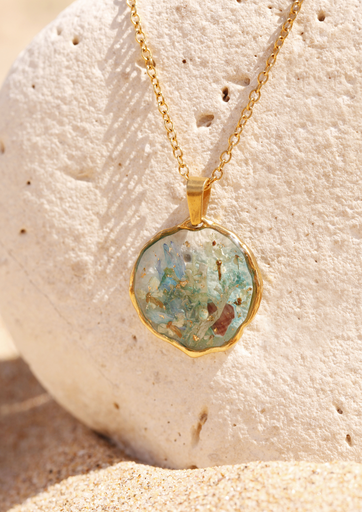 Un jardin marin éthéré s’épanouit sous des courants dorés, où la flore fleurit comme des étoiles. Au centre, une sirène aux cheveux lilas tient un pendentif en forme de boussole — symbole de mémoire, de quête et d’orientation intérieure. Des pissenlits bleus dérivent, traçant des constellations invisibles sous la mer.