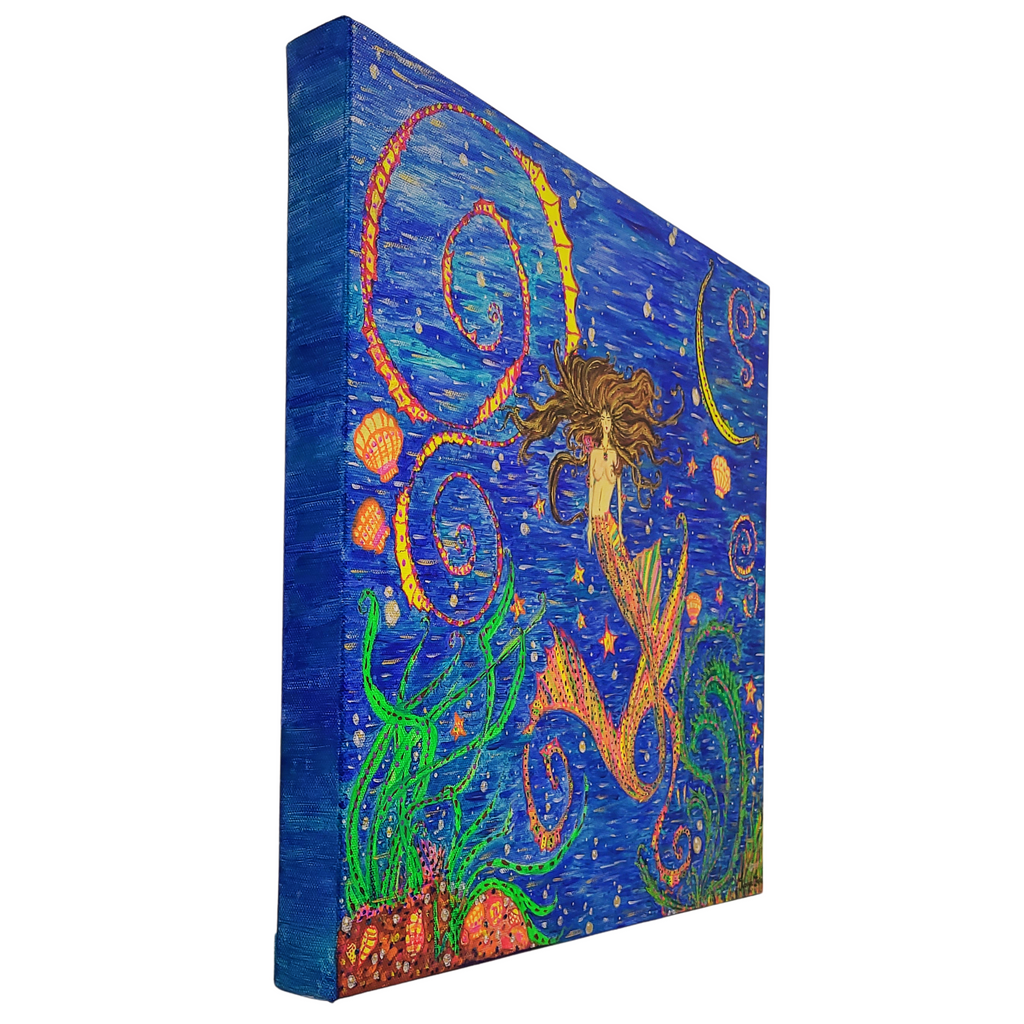Un rêve marin profond où créatures serpentines, perles lumineuses et sirène baignée de lune se fondent dans un même mouvement. Sa queue, sertie de couleurs et d’ombres, incarne le silence autant que le rythme céleste — une méditation sur le cosmos reflété par l’océan.