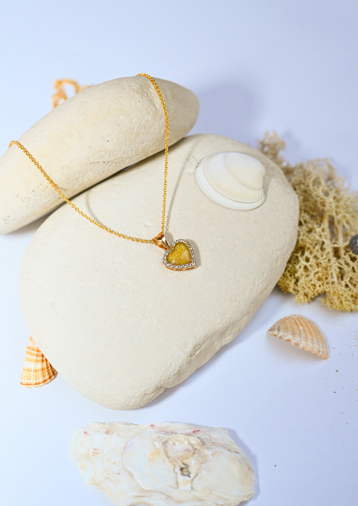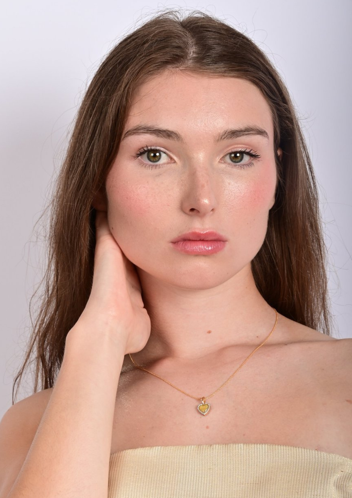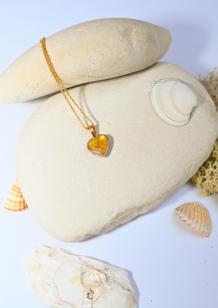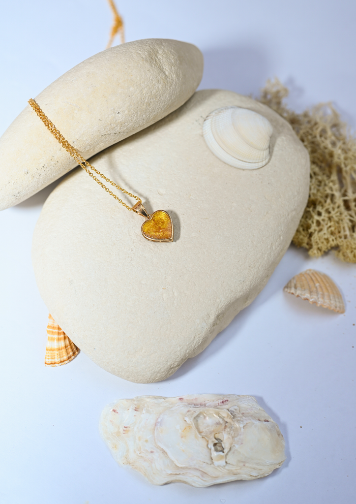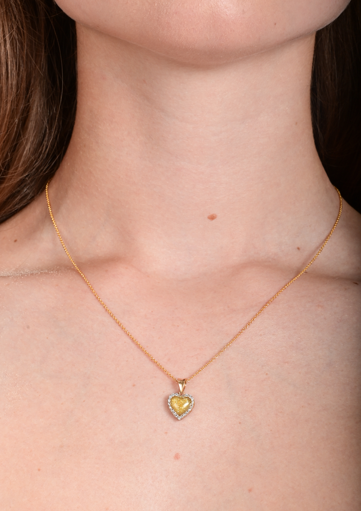 Ce délicat pendentif en forme de cœur, de 1 cm, s’illumine en son centre d’une poudre d’or 24 carats ponctuée de fines paillettes dorées. Au revers, une poussière de nacre diffuse une lumière douce et irisée, telle une lueur lunaire.