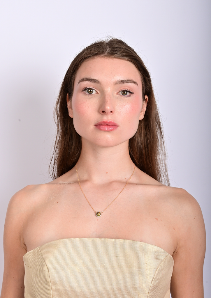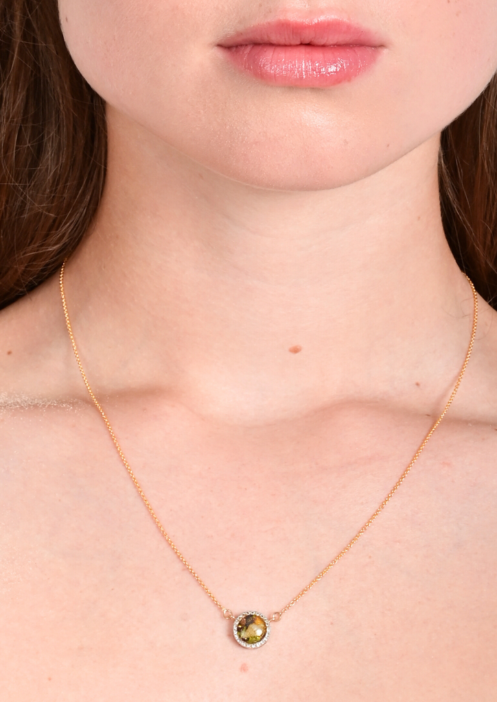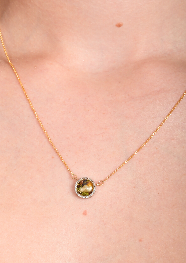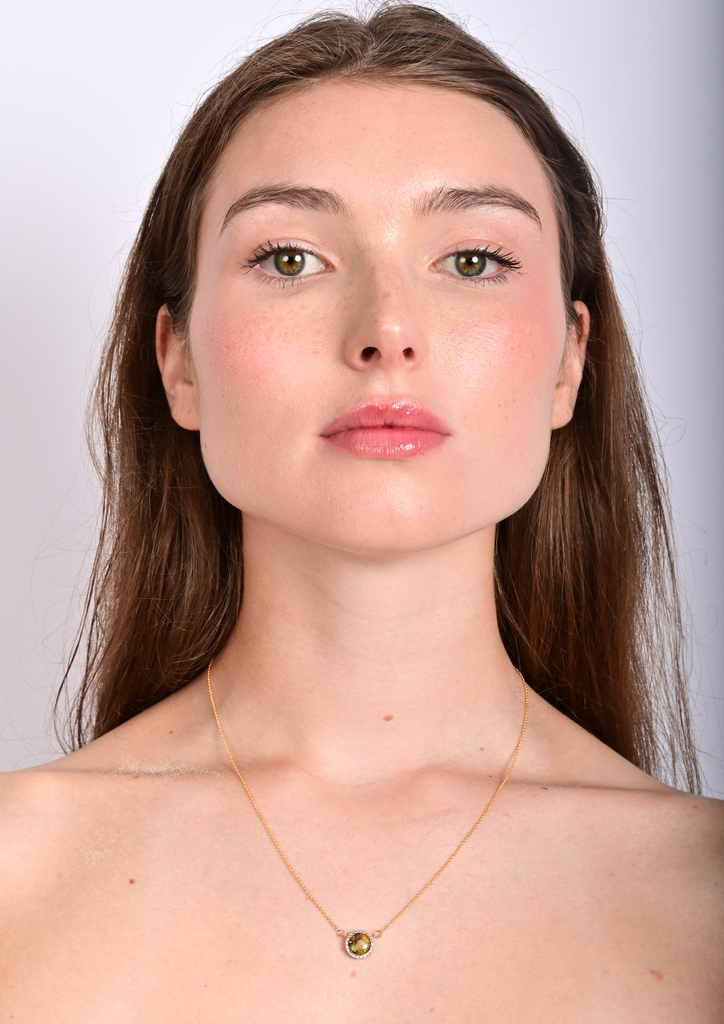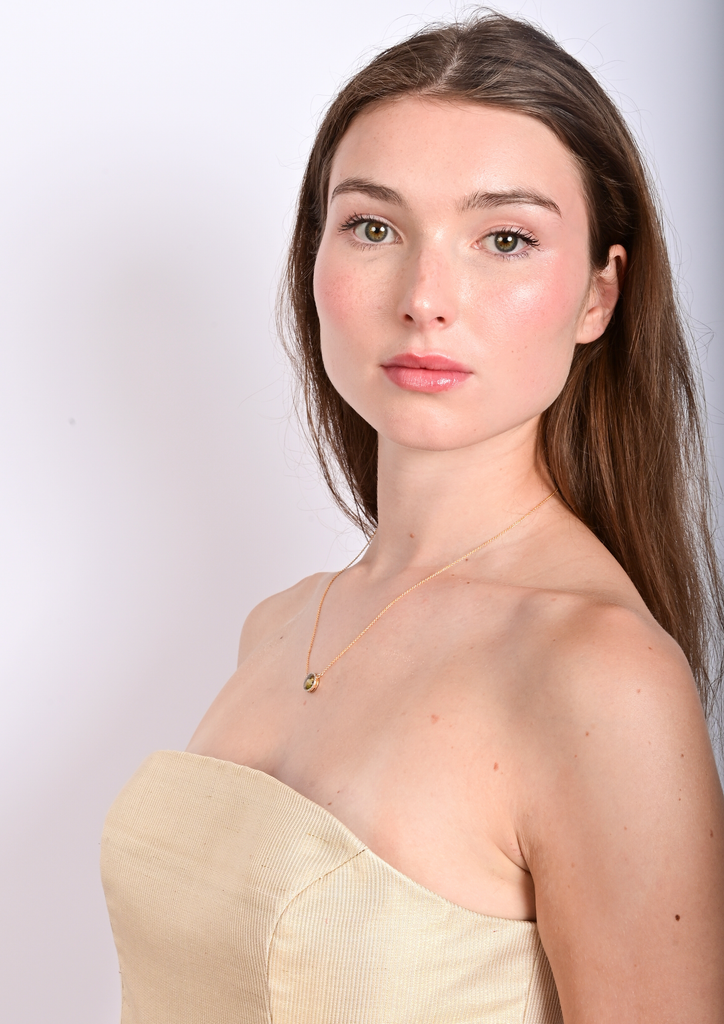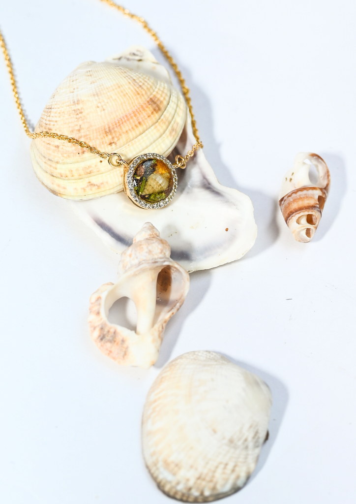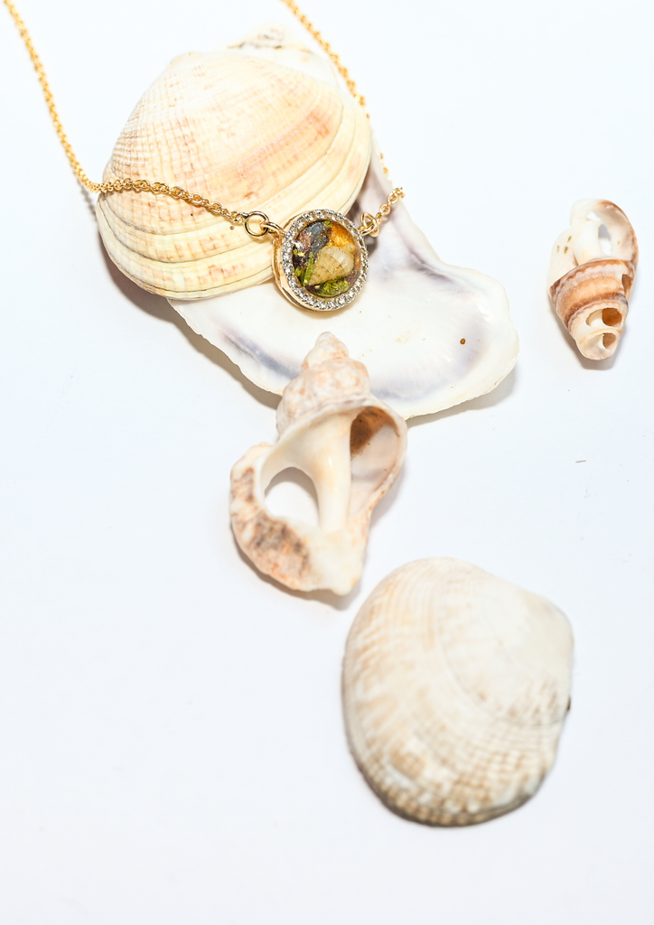 Ce pendentif circulaire, délicatement ceinturé de zircones, s’illumine d’un fond scintillant de poussière d’or 24 carats. En son cœur repose un coquillage spiralé, lové entre de fines fleurs bordeaux et un unique bleuet — fleur de la mémoire et de la fidélité.