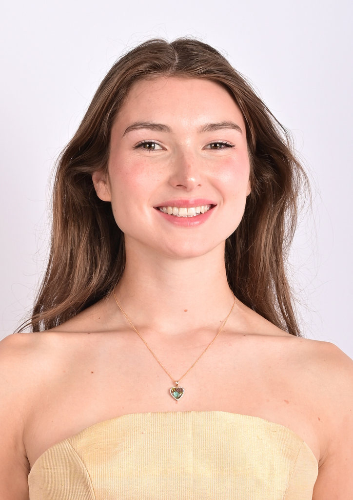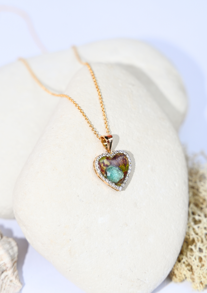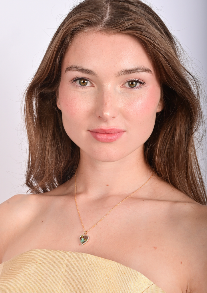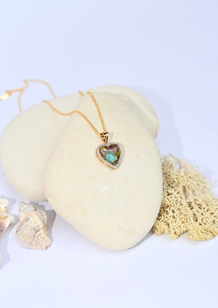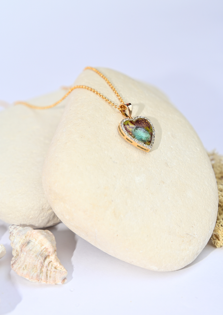 Ce cœur en or recyclé 18 carats, auréolé de zircones, abrite un cristal d’aigue-marine ovale aux nuances turquoise, lumineux comme la Côte d’Azur sous le soleil. Au-dessus, un fragment de coquille escargot déploie ses volutes ivoire et bordeaux, rappelant le mouvement lent et hypnotique des marées.