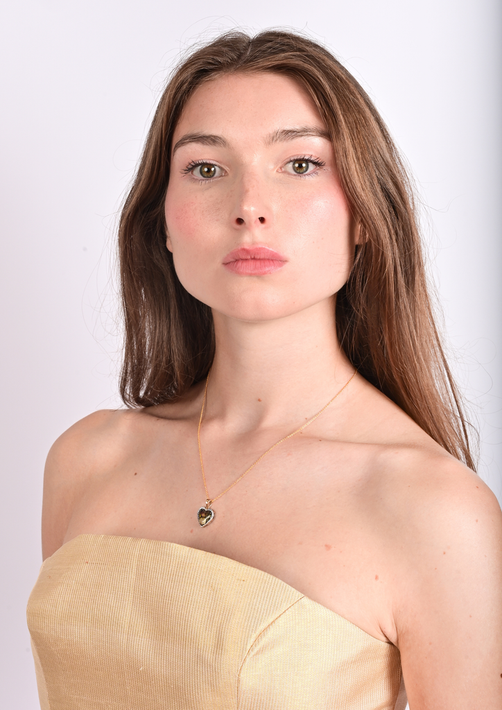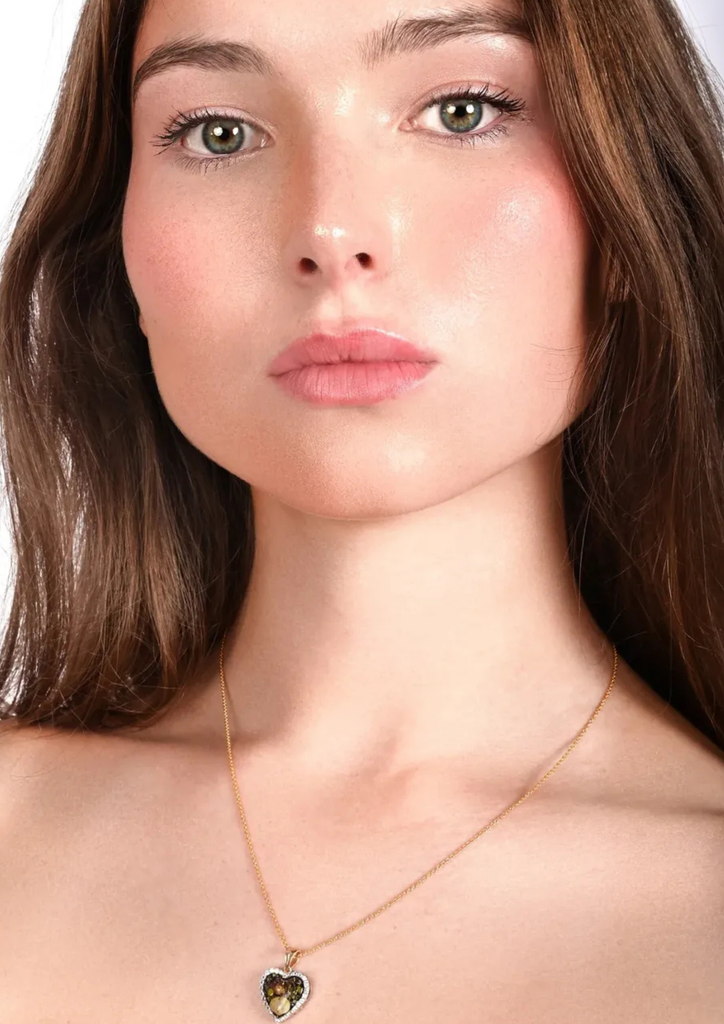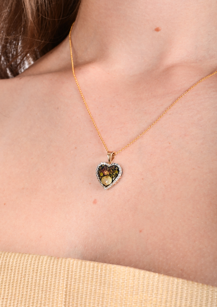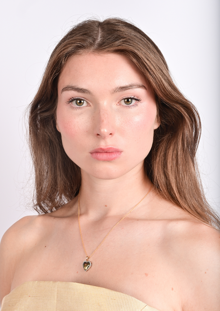 Enchâssé dans un cœur d’or éthique 18 carats, bordé de zircones, ce pendentif révèle à sa base un coquillage en éventail, délicatement posé comme une offrande marine. Derrière lui, feuillages, algues et fleurs aux tonalités bordeaux et magenta semblent onduler, portés par un courant invisible.