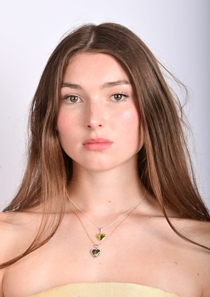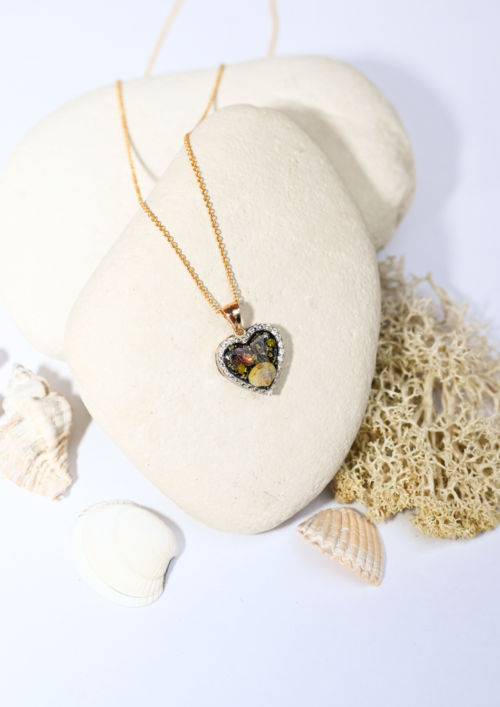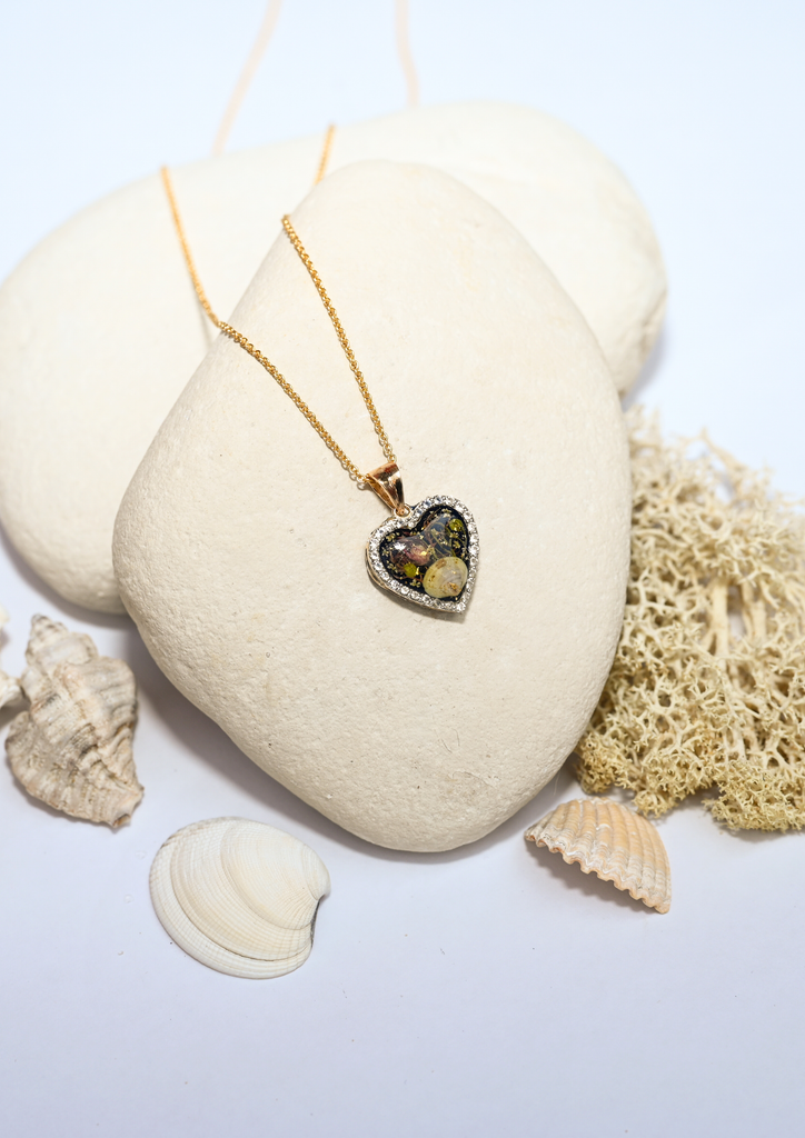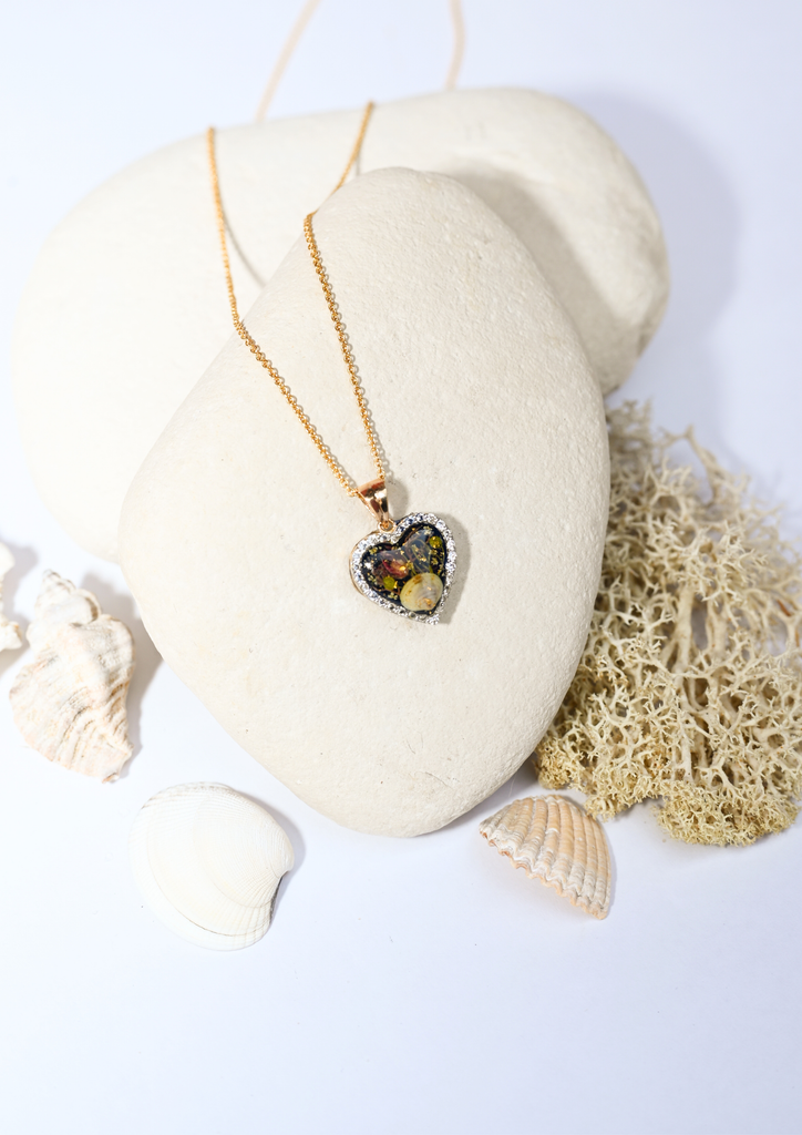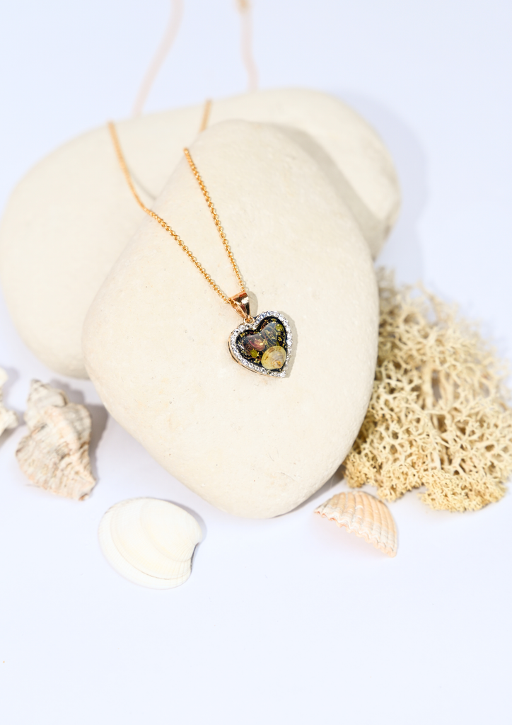 Enchâssé dans un cœur d’or éthique 18 carats, bordé de zircones, ce pendentif révèle à sa base un coquillage en éventail, délicatement posé comme une offrande marine. Derrière lui, feuillages, algues et fleurs aux tonalités bordeaux et magenta semblent onduler, portés par un courant invisible.