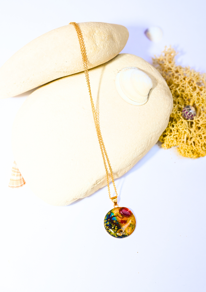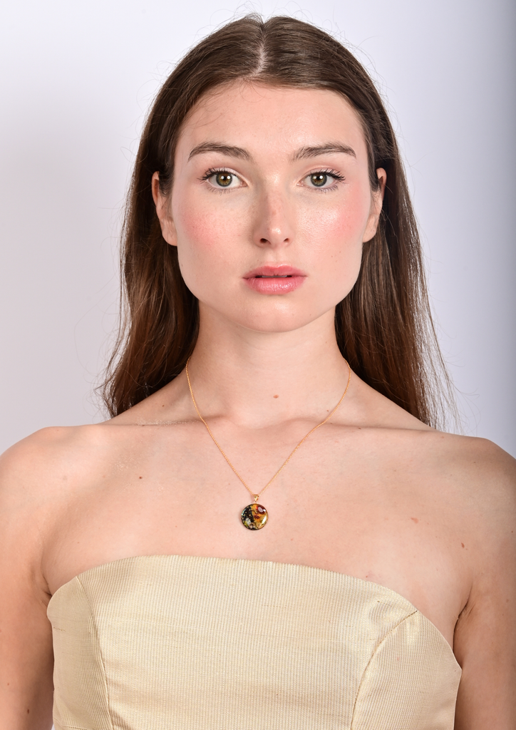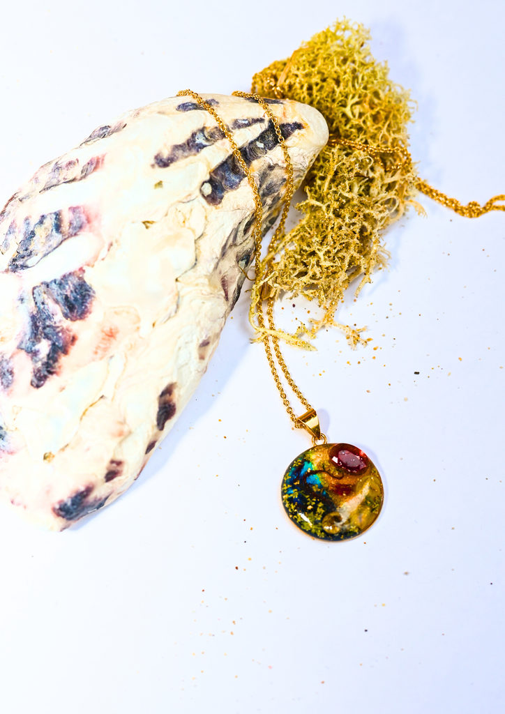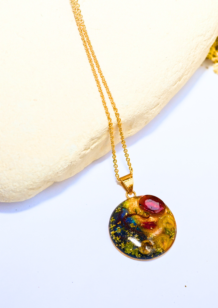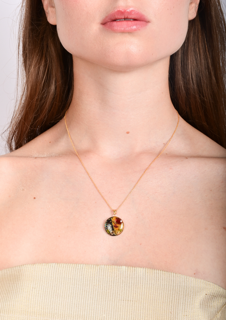 Ce pendentif circulaire de 1,8 cm en or recyclé 18 carats présente un fond divisé entre une poudre lumineuse d’or 24 carats et un bleu océan profond — l’étreinte du jour et de la nuit. À sa base reposent un coquillage spiralé et deux coquillages en éventail, délicatement encadrés de feuillages, de carotte sauvage en profusion et de fleurs d’algues aux nuances rosées et rouges.