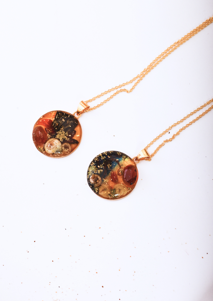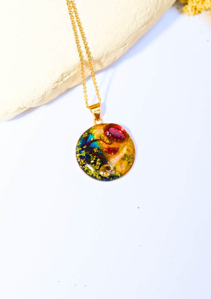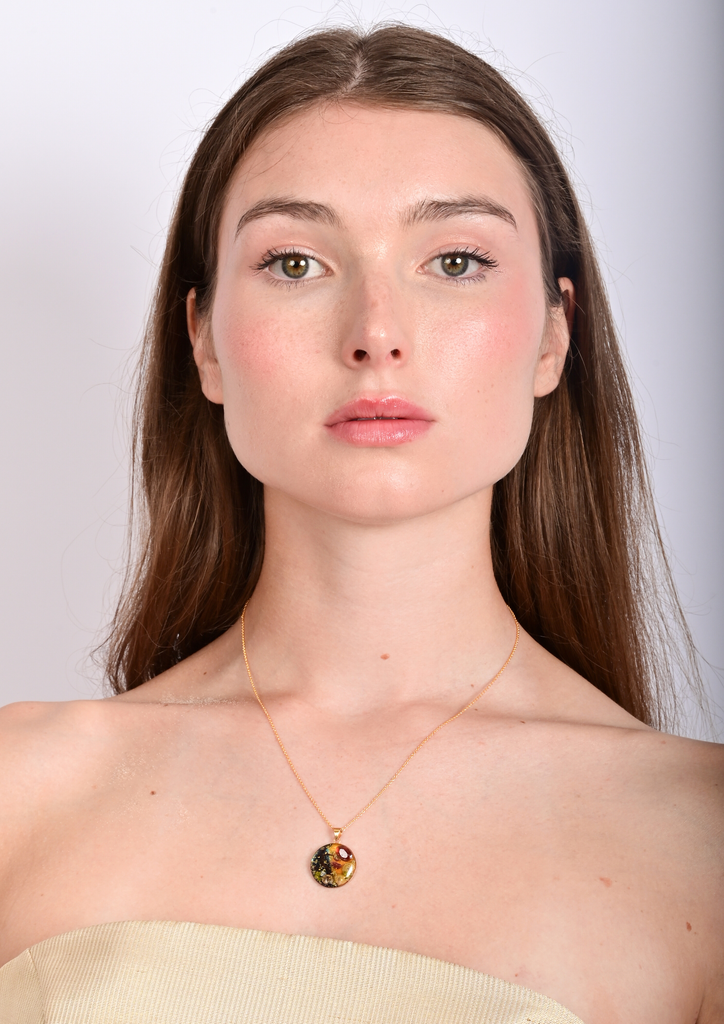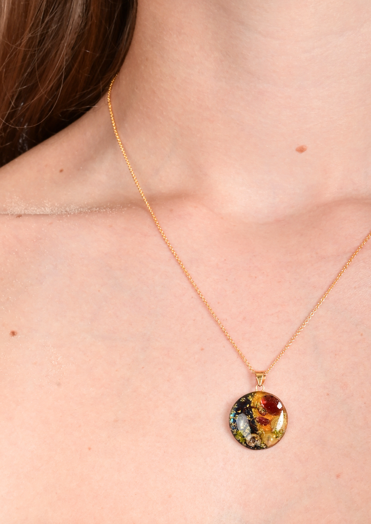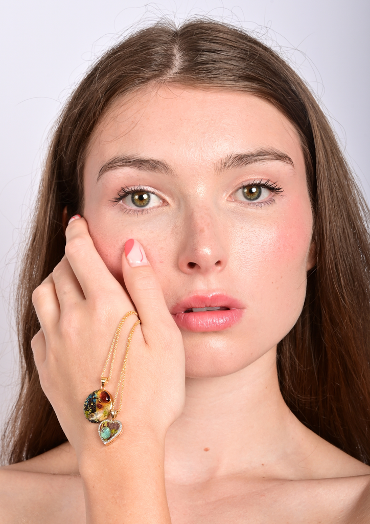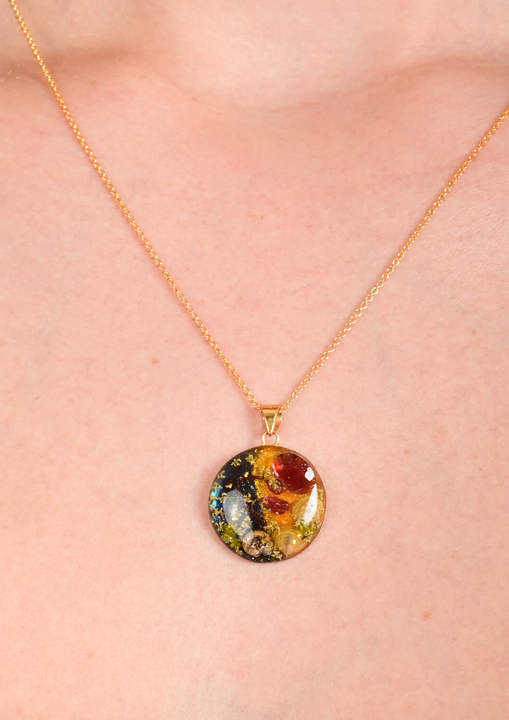 Ce pendentif circulaire de 1,8 cm en or recyclé 18 carats présente un fond divisé entre une poudre lumineuse d’or 24 carats et un bleu océan profond — l’étreinte du jour et de la nuit. À sa base reposent un coquillage spiralé et deux coquillages en éventail, délicatement encadrés de feuillages, de carotte sauvage en profusion et de fleurs d’algues aux nuances rosées et rouges.