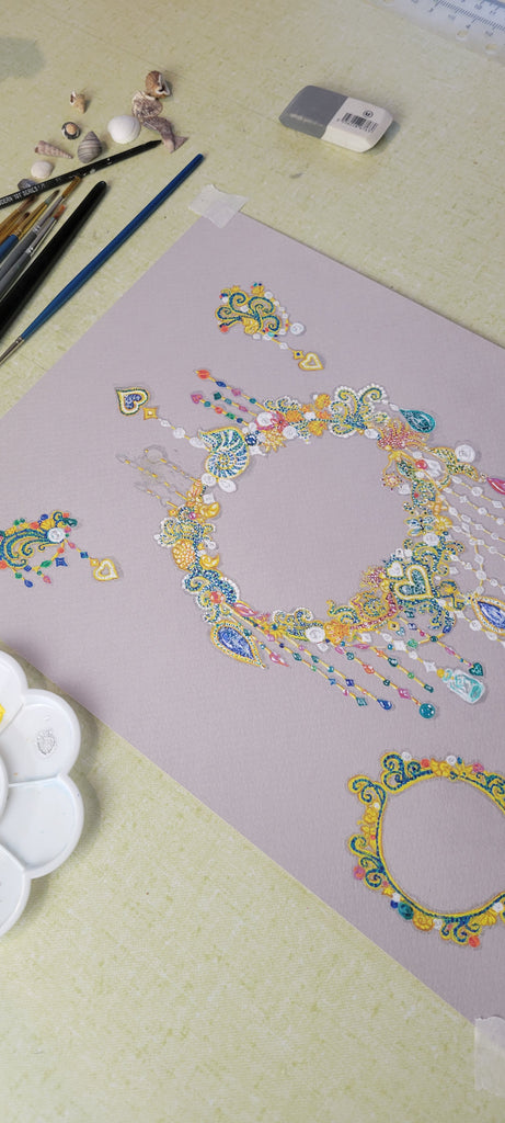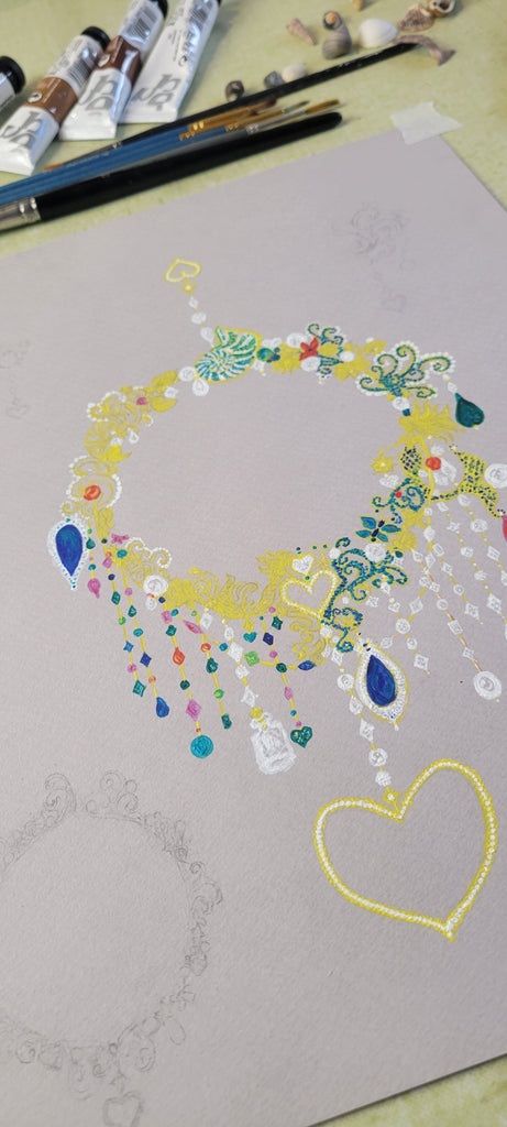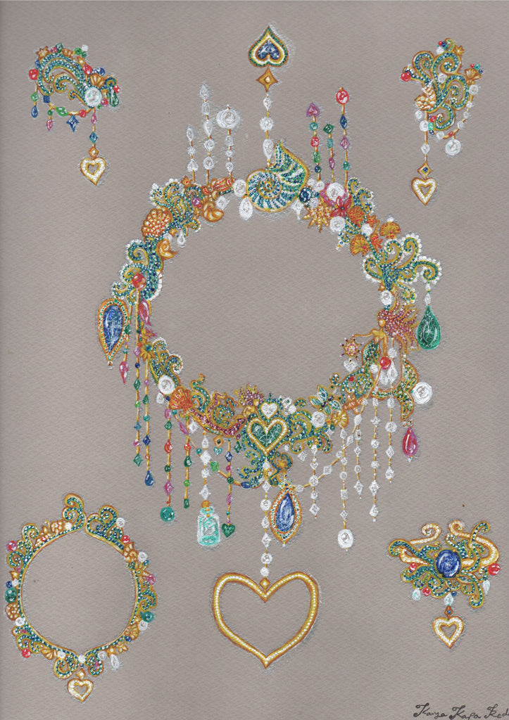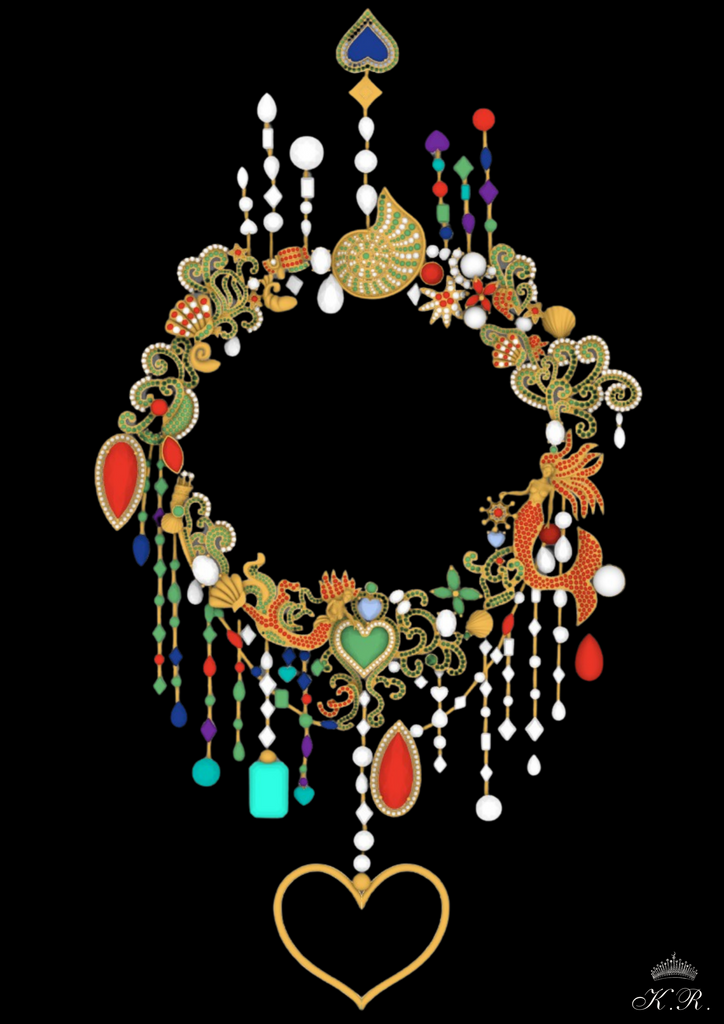 Sur l’un des flancs, une sirène s’élève, souveraine et gracieuse, guidant sa traversée à l’aide d’une roue de marin finement sculptée. Au cœur de la composition apparaît son reflet — muse des profondeurs, couronnée de deux cœurs enlacés d’émeraude et de diamant, symbole d’unité et de destinée. De l’architecture du collier naissent des cascades de gemmes et de perles, chacune unique dans son rythme et ses nuances. En leur centre descend la plus longue chute, s’achevant par un cœur de diamant ajouré de trois centimètres, lumineux et libre — emblème de dévotion, d’éternité et de mouvement infini.